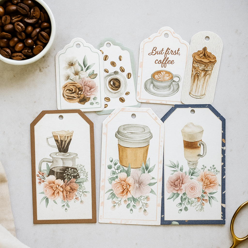 Printed on sturdy 240 gsm FSC-certified cardstock, these versatile tags come in three sizes with pre-punched holes, perfect for cards, scrapbooks, journals, and more. Elevate your projects with a cozy coffee break vibe!